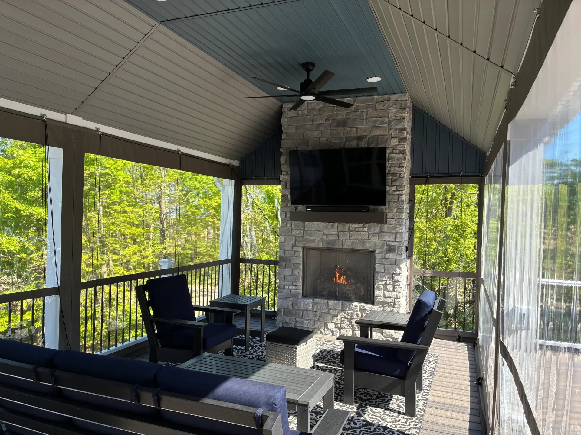 Our porch enclosures are designed for year-round versatility. In the summer, roll the clear vinyl or Sunbrella curtains up to enjoy fresh air, unobstructed views, and an open-air experience. In the winter, lower the enclosures to create a warm, protected space that shields you from wind, rain, and cold, turning your deck or patio into a comfortable outdoor room no matter the season.