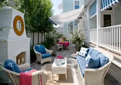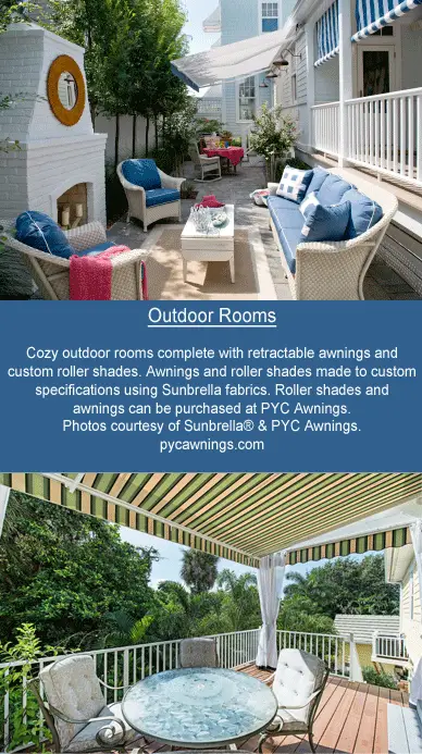 Don’t be afraid to add stylish accents and traditional indoor furnishings to your outdoor room. Carpets, throw pillows for furniture, and other design touches will create a welcoming feel. Just make sure they’re Sunbrella fabrics if they’ll be exposed to the elements.