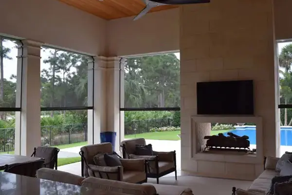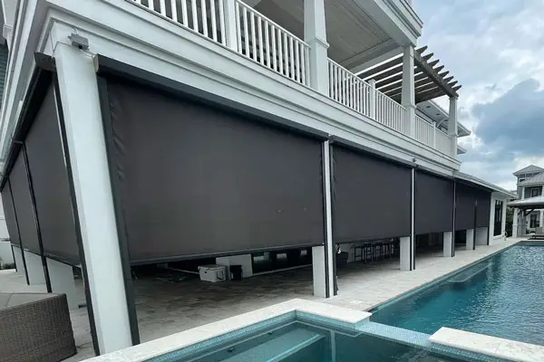 Motorized enclosures use a small electric motor and a remote or wall switch. Panels glide up and down inside tracks or cables. Systems similar to the retractable porch enclosures many homeowners choose give push‑button control and a clean, modern look.