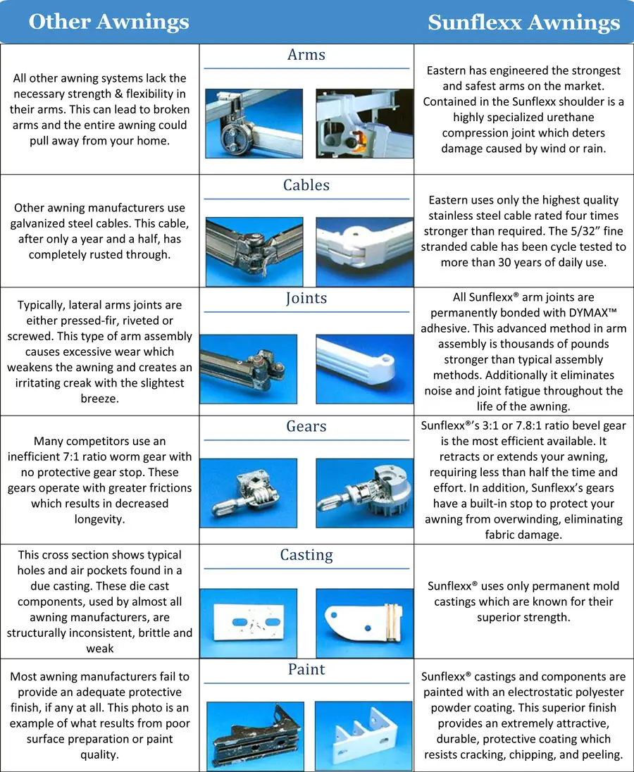 Compare Sunflexx Awning Frames and see why Sunflexx Retractable Awnings are the best value and can provide many years of shade, without any costly repairs or service. Sunflexx Awnings are built to last.